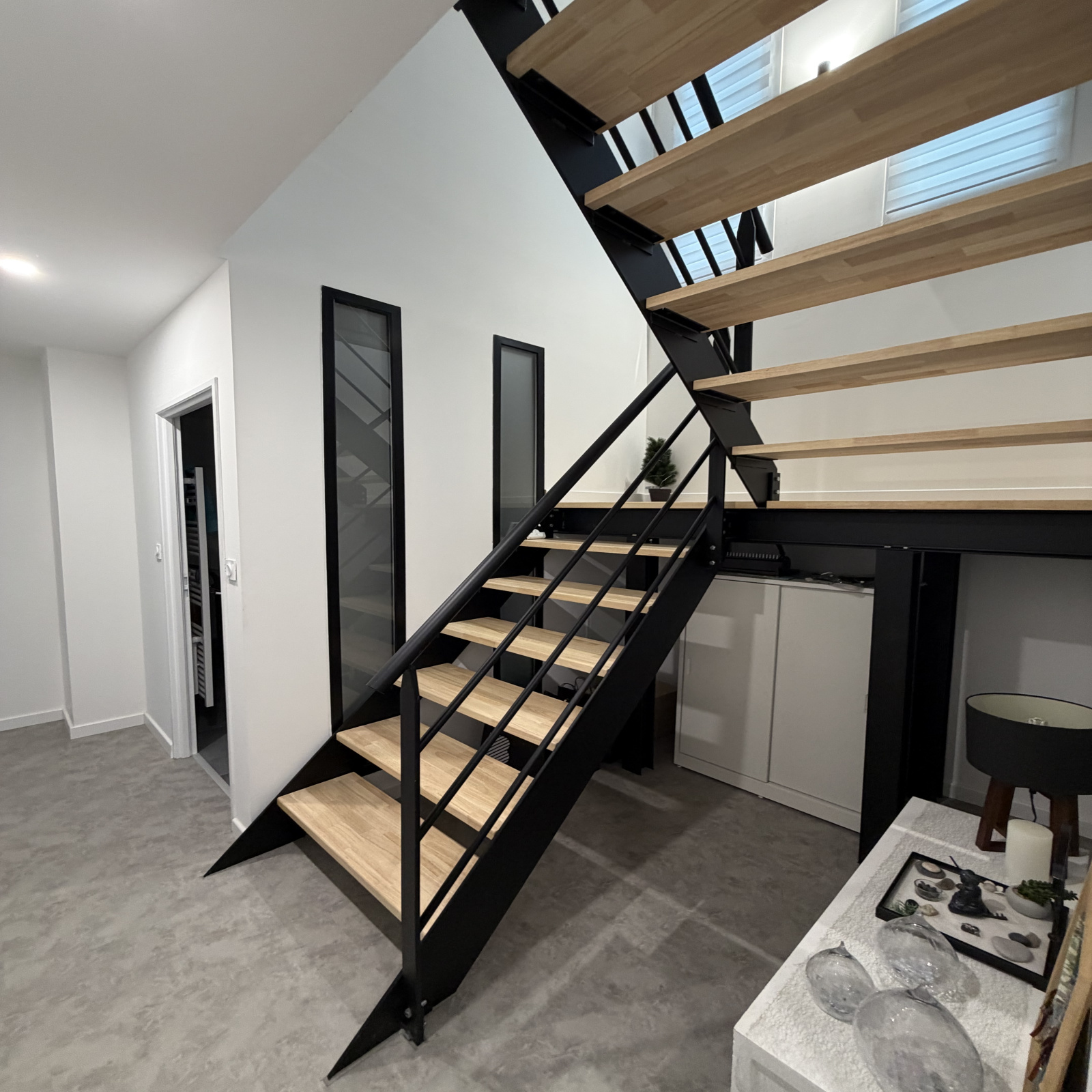 Elle est mitoyenne d'un côté, et se compose au rez-de-chaussée, d'une entrée avec placard avec un wc indépendant, d'un grand salon séjour avec la cuisine ouverte, ainsi que l'accès au garage. De la cuisine, se trouve un accès direct à la terrasse.