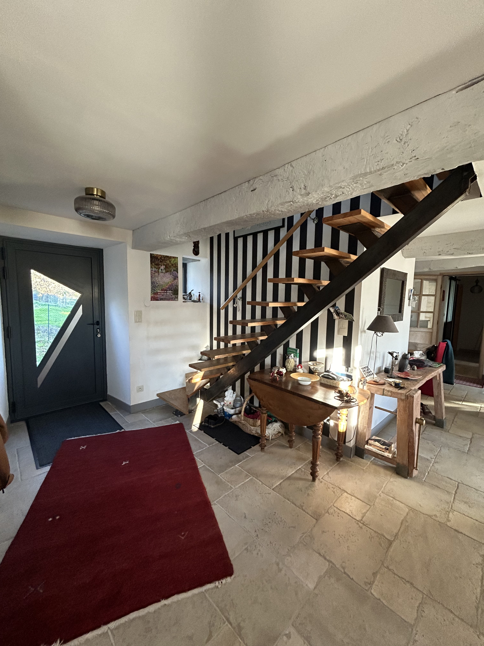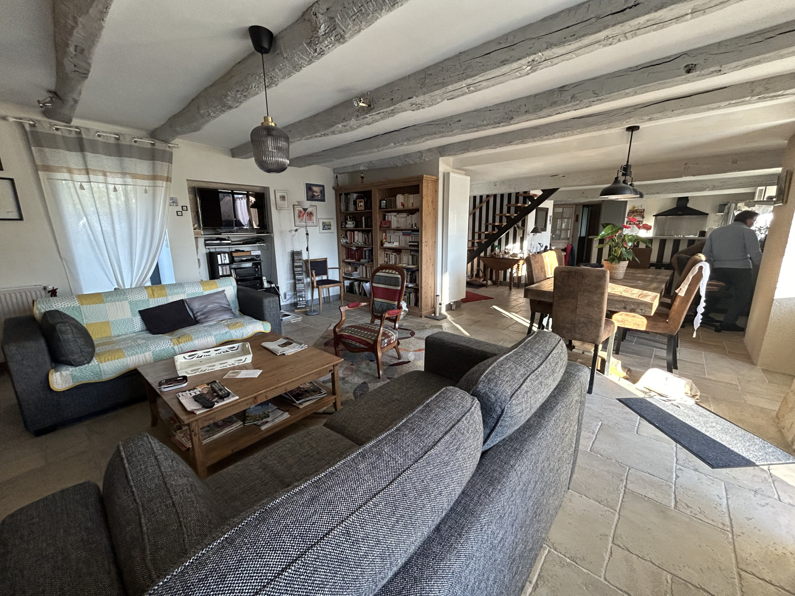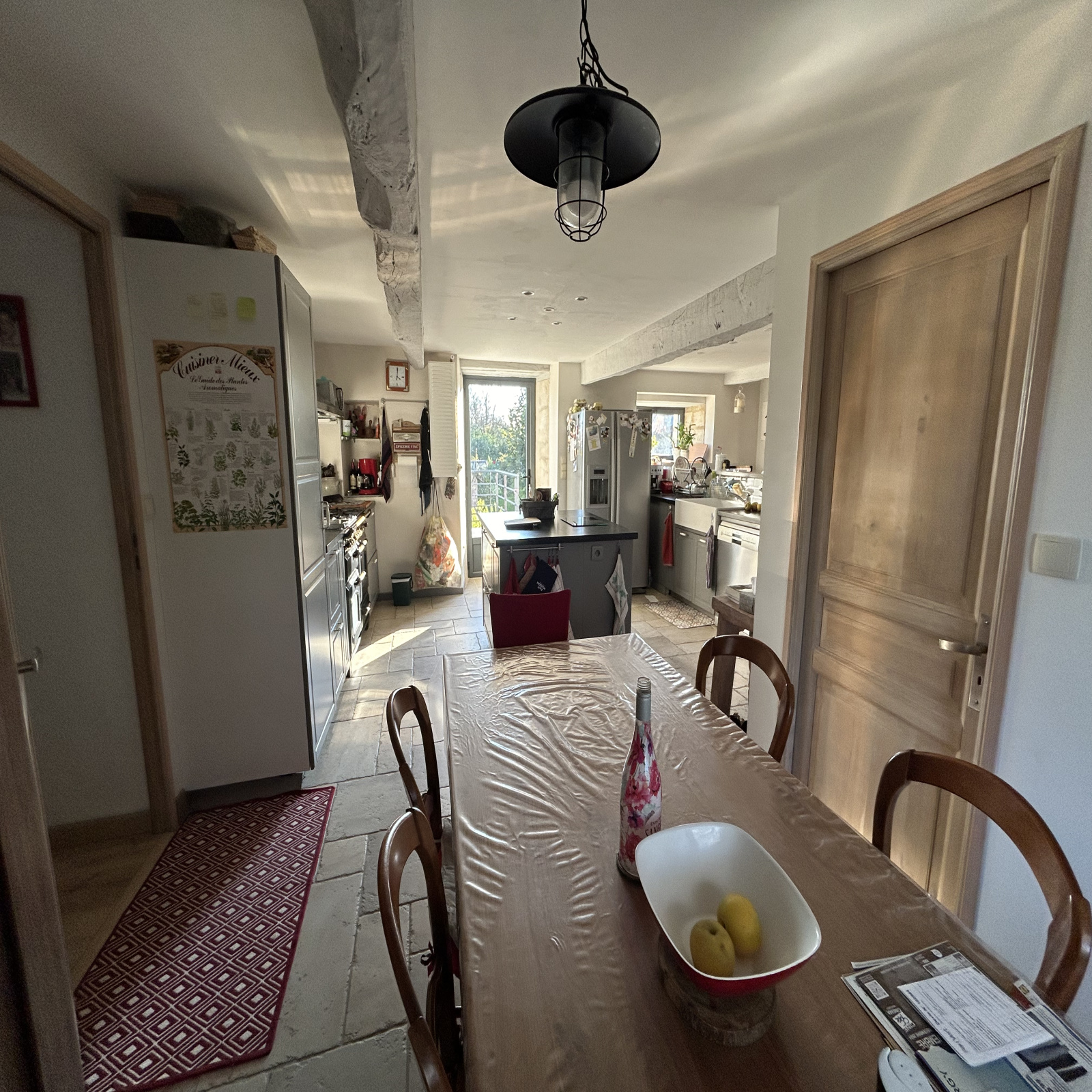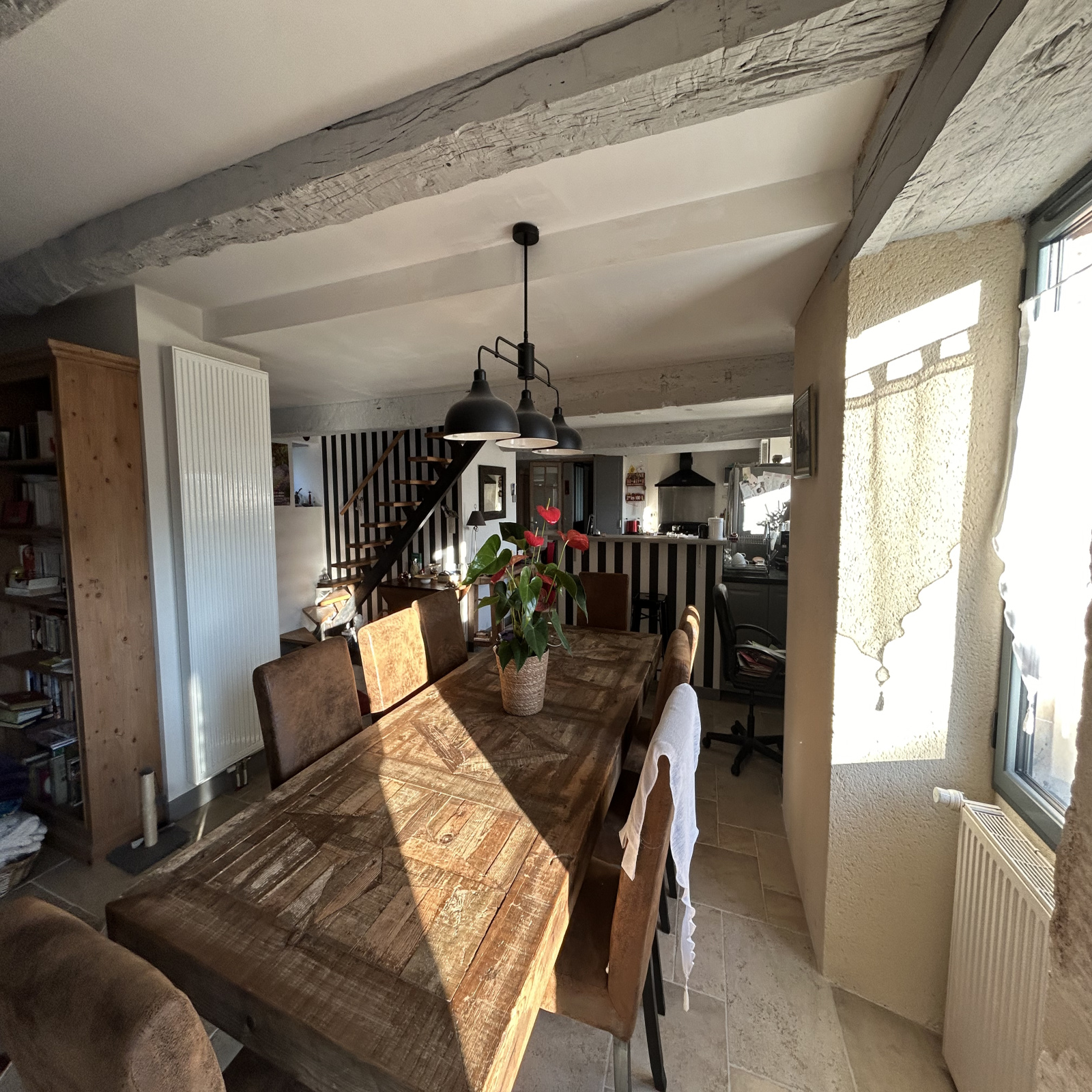 La piéce de vie dispose d'une cheminée majestueuse d'époque et la maison est équipée d'une chaudiére récente a granulé.